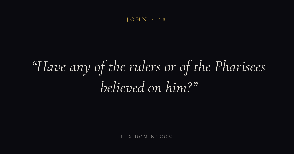 Books / John / Chapter 7 / Verse 48 ← John 7:47 John 7:48 John 7:49 → Have any of the rulers or of the Pharisees believed on him? Download verse card Share on Twitter Share on Facebook Pin it ✦ Key themes LoveFaithWisdomGraceIncarnation Read with John 7:49John 3:161 Corinthians 13:4Hebrews 11:1 Related topics Bible verses about loveBible verses about faithBible verses about wisdomBible verses about grace ✦ John Chapter 7 verses V. 1 V. 2 V. 3 V. 4 V. 5 V. 6 V. 7 V. 8 V. 9 V. 10 V. 11 V. 12 V. 13 V. 14 V. 15 V. 16 V. 17 V. 18 V. 19 V. 20 V. 21 V. 22 V. 23 V. 24 V. 25 V. 26 V. 27 V. 28 V. 29 V. 30 V. 31 V. 32 V. 33 V. 34 V. 35 V. 36 V. 37 V. 38 V. 39 V. 40 V. 41 V. 42 V. 43 V. 44 V. 45 V. 46 V. 47 V. 48 V. 49 V. 50 V. 51 V. 52 V. 53