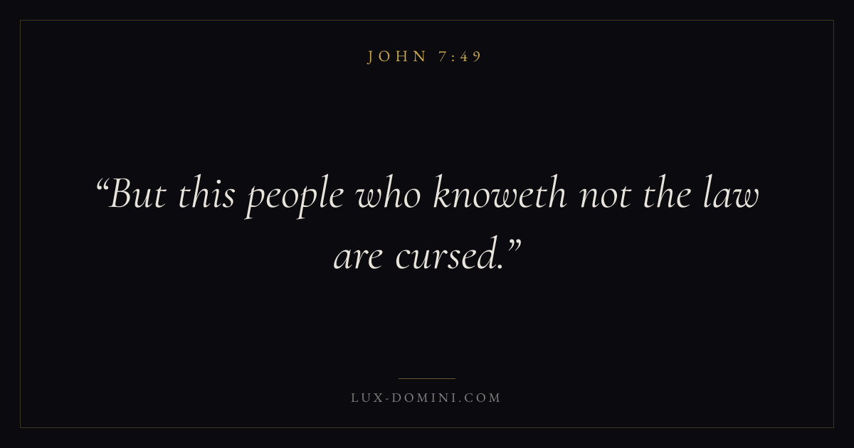Books / John / Chapter 7 / Verse 49 ← John 7:48 John 7:49 John 7:50 → But this people who knoweth not the law are cursed. Download verse card Share on Twitter Share on Facebook Pin it ✦ Key themes LoveFaithWisdomGraceIncarnation Read with John 7:48John 3:161 Corinthians 13:4Hebrews 11:1 Related topics Bible verses about loveBible verses about faithBible verses about wisdomBible verses about grace ✦ John Chapter 7 verses V. 1 V. 2 V. 3 V. 4 V. 5 V. 6 V. 7 V. 8 V. 9 V. 10 V. 11 V. 12 V. 13 V. 14 V. 15 V. 16 V. 17 V. 18 V. 19 V. 20 V. 21 V. 22 V. 23 V. 24 V. 25 V. 26 V. 27 V. 28 V. 29 V. 30 V. 31 V. 32 V. 33 V. 34 V. 35 V. 36 V. 37 V. 38 V. 39 V. 40 V. 41 V. 42 V. 43 V. 44 V. 45 V. 46 V. 47 V. 48 V. 49 V. 50 V. 51 V. 52 V. 53