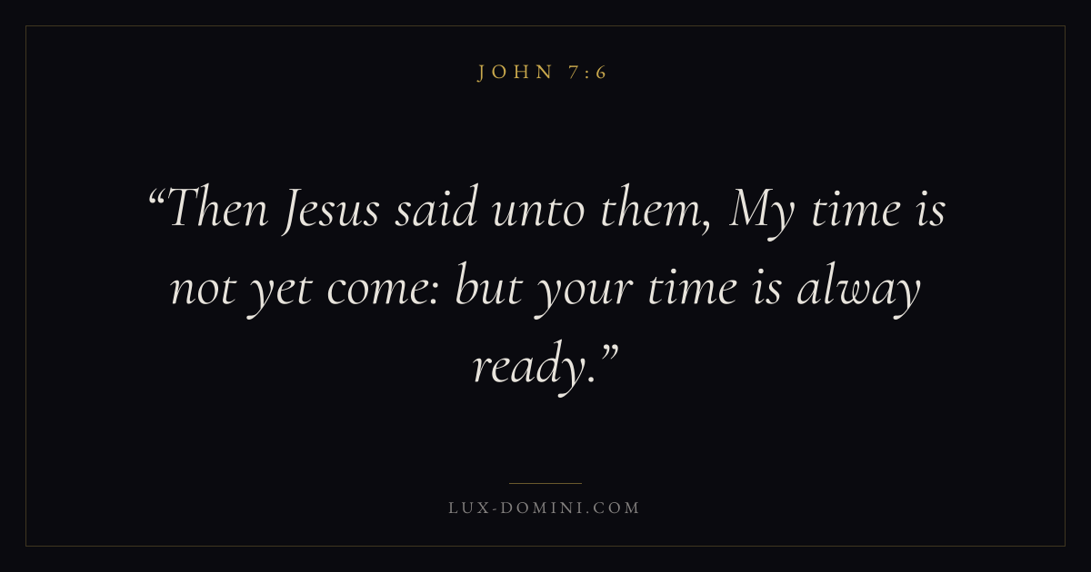 Books / John / Chapter 7 / Verse 6 ← John 7:5 John 7:6 John 7:7 → Then Jesus said unto them, My time is not yet come: but your time is alway ready. Download verse card Share on Twitter Share on Facebook Pin it ✦ Key themes LoveFaithTruthIncarnation Read with John 7:3John 7:4John 3:161 Corinthians 13:4 Related topics Bible verses about loveBible verses about faithBible verses about truth ✦ John Chapter 7 verses V. 1 V. 2 V. 3 V. 4 V. 5 V. 6 V. 7 V. 8 V. 9 V. 10 V. 11 V. 12 V. 13 V. 14 V. 15 V. 16 V. 17 V. 18 V. 19 V. 20 V. 21 V. 22 V. 23 V. 24 V. 25 V. 26 V. 27 V. 28 V. 29 V. 30 V. 31 V. 32 V. 33 V. 34 V. 35 V. 36 V. 37 V. 38 V. 39 V. 40 V. 41 V. 42 V. 43 V. 44 V. 45 V. 46 V. 47 V. 48 V. 49 V. 50 V. 51 V. 52 V. 53