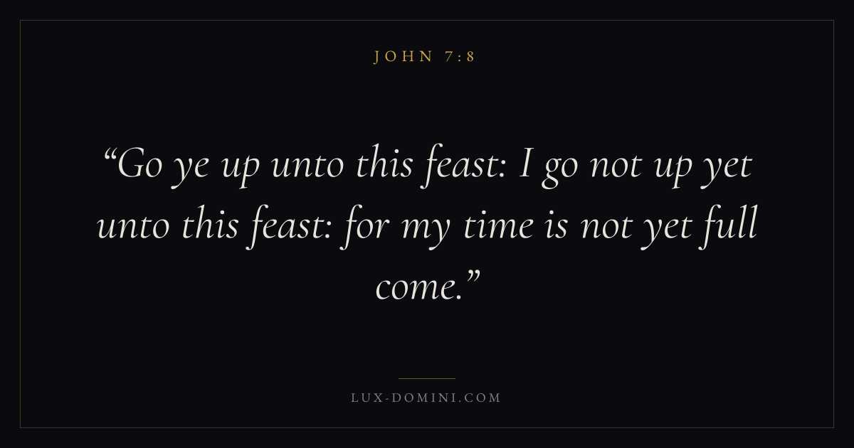 Books / John / Chapter 7 / Verse 8 ← John 7:7 John 7:8 John 7:9 → Go ye up unto this feast: I go not up yet unto this feast: for my time is not yet full come. Download verse card Share on Twitter Share on Facebook Pin it ✦ Key themes LoveFaithTruthIncarnation Read with John 7:7John 7:9John 3:161 Corinthians 13:4 Related topics Bible verses about loveBible verses about faithBible verses about truth ✦ John Chapter 7 verses V. 1 V. 2 V. 3 V. 4 V. 5 V. 6 V. 7 V. 8 V. 9 V. 10 V. 11 V. 12 V. 13 V. 14 V. 15 V. 16 V. 17 V. 18 V. 19 V. 20 V. 21 V. 22 V. 23 V. 24 V. 25 V. 26 V. 27 V. 28 V. 29 V. 30 V. 31 V. 32 V. 33 V. 34 V. 35 V. 36 V. 37 V. 38 V. 39 V. 40 V. 41 V. 42 V. 43 V. 44 V. 45 V. 46 V. 47 V. 48 V. 49 V. 50 V. 51 V. 52 V. 53