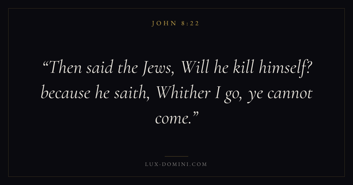 Books / John / Chapter 8 / Verse 22 ← John 8:21 John 8:22 John 8:23 → Then said the Jews, Will he kill himself? because he saith, Whither I go, ye cannot come. Download verse card Share on Twitter Share on Facebook Pin it ✦ Key themes LoveFaithTruthIncarnation Read with John 8:20John 8:21John 3:161 Corinthians 13:4 Related topics Bible verses about loveBible verses about faithBible verses about truth ✦ John Chapter 8 verses V. 1 V. 2 V. 3 V. 4 V. 5 V. 6 V. 7 V. 8 V. 9 V. 10 V. 11 V. 12 V. 13 V. 14 V. 15 V. 16 V. 17 V. 18 V. 19 V. 20 V. 21 V. 22 V. 23 V. 24 V. 25 V. 26 V. 27 V. 28 V. 29 V. 30 V. 31 V. 32 V. 33 V. 34 V. 35 V. 36 V. 37 V. 38 V. 39 V. 40 V. 41 V. 42 V. 43 V. 44 V. 45 V. 46 V. 47 V. 48 V. 49 V. 50 V. 51 V. 52 V. 53 V. 54 V. 55 V. 56 V. 57 V. 58 V. 59