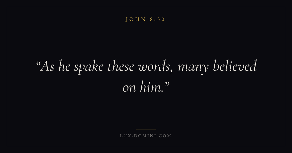 Books / John / Chapter 8 / Verse 30 ← John 8:29 John 8:30 John 8:31 → As he spake these words, many believed on him. Download verse card Share on Twitter Share on Facebook Pin it ✦ Key themes LoveFaithTruthIncarnation Read with John 8:31John 8:32John 3:161 Corinthians 13:4 Related topics Bible verses about loveBible verses about faithBible verses about truth ✦ John Chapter 8 verses V. 1 V. 2 V. 3 V. 4 V. 5 V. 6 V. 7 V. 8 V. 9 V. 10 V. 11 V. 12 V. 13 V. 14 V. 15 V. 16 V. 17 V. 18 V. 19 V. 20 V. 21 V. 22 V. 23 V. 24 V. 25 V. 26 V. 27 V. 28 V. 29 V. 30 V. 31 V. 32 V. 33 V. 34 V. 35 V. 36 V. 37 V. 38 V. 39 V. 40 V. 41 V. 42 V. 43 V. 44 V. 45 V. 46 V. 47 V. 48 V. 49 V. 50 V. 51 V. 52 V. 53 V. 54 V. 55 V. 56 V. 57 V. 58 V. 59