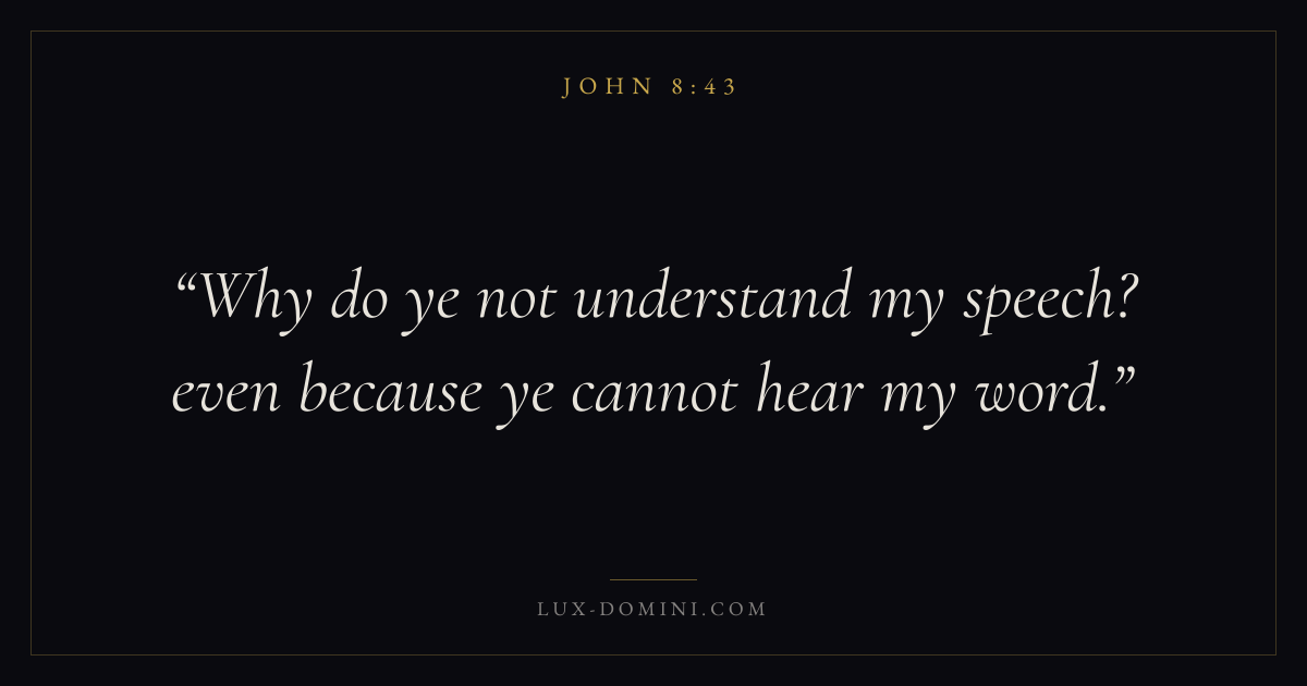 Books / John / Chapter 8 / Verse 43 ← John 8:42 John 8:43 John 8:44 → Why do ye not understand my speech? even because ye cannot hear my word. Download verse card Share on Twitter Share on Facebook Pin it ✦ Key themes LoveFaithTruthIncarnation Read with John 8:41John 8:42John 3:161 Corinthians 13:4 Related topics Bible verses about loveBible verses about faithBible verses about truth ✦ John Chapter 8 verses V. 1 V. 2 V. 3 V. 4 V. 5 V. 6 V. 7 V. 8 V. 9 V. 10 V. 11 V. 12 V. 13 V. 14 V. 15 V. 16 V. 17 V. 18 V. 19 V. 20 V. 21 V. 22 V. 23 V. 24 V. 25 V. 26 V. 27 V. 28 V. 29 V. 30 V. 31 V. 32 V. 33 V. 34 V. 35 V. 36 V. 37 V. 38 V. 39 V. 40 V. 41 V. 42 V. 43 V. 44 V. 45 V. 46 V. 47 V. 48 V. 49 V. 50 V. 51 V. 52 V. 53 V. 54 V. 55 V. 56 V. 57 V. 58 V. 59