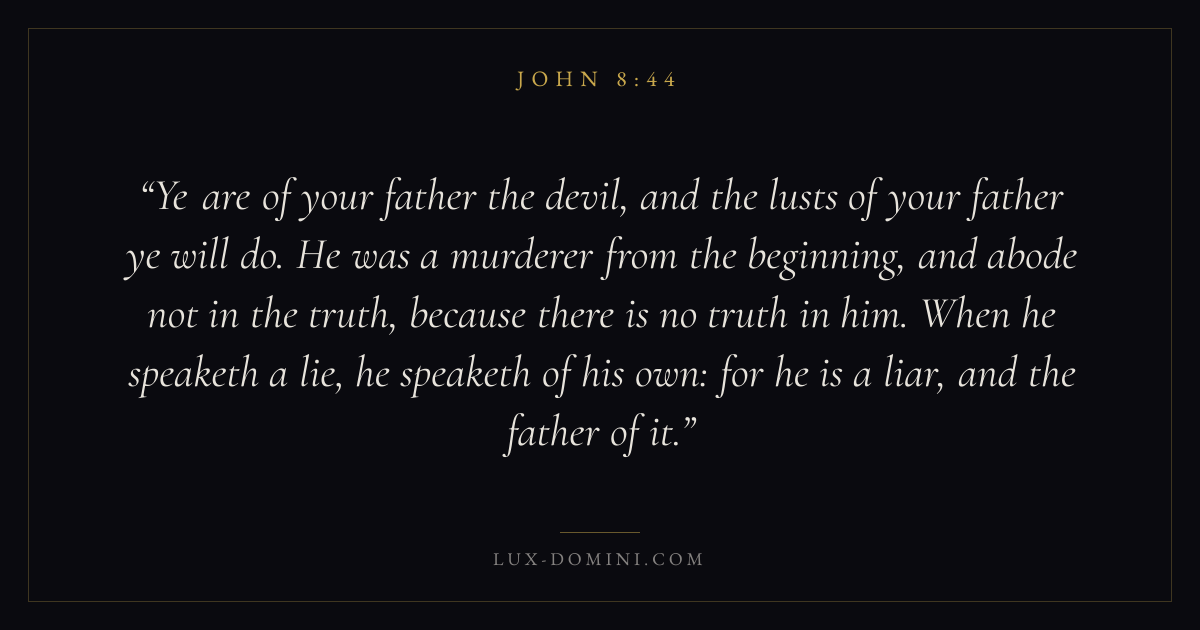 Ye are of your father the devil, and the lusts of your father ye will do. He was a murderer from the beginning, and abode not in the truth, because there is no truth in him. When he speaketh a lie, he speaketh of his own: for he is a liar, and the father of it.