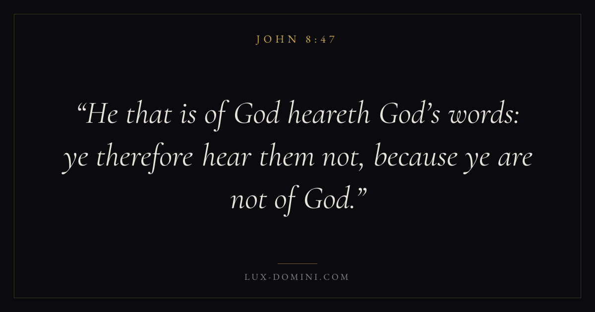 Books / John / Chapter 8 / Verse 47 ← John 8:46 John 8:47 John 8:48 → He that is of God heareth God’s words: ye therefore hear them not, because ye are not of God. Download verse card Share on Twitter Share on Facebook Pin it ✦ Key themes LoveFaithTruthIncarnation Read with John 8:48John 3:161 Corinthians 13:4Hebrews 11:1 Related topics Bible verses about loveBible verses about faithBible verses about truth ✦ John Chapter 8 verses V. 1 V. 2 V. 3 V. 4 V. 5 V. 6 V. 7 V. 8 V. 9 V. 10 V. 11 V. 12 V. 13 V. 14 V. 15 V. 16 V. 17 V. 18 V. 19 V. 20 V. 21 V. 22 V. 23 V. 24 V. 25 V. 26 V. 27 V. 28 V. 29 V. 30 V. 31 V. 32 V. 33 V. 34 V. 35 V. 36 V. 37 V. 38 V. 39 V. 40 V. 41 V. 42 V. 43 V. 44 V. 45 V. 46 V. 47 V. 48 V. 49 V. 50 V. 51 V. 52 V. 53 V. 54 V. 55 V. 56 V. 57 V. 58 V. 59