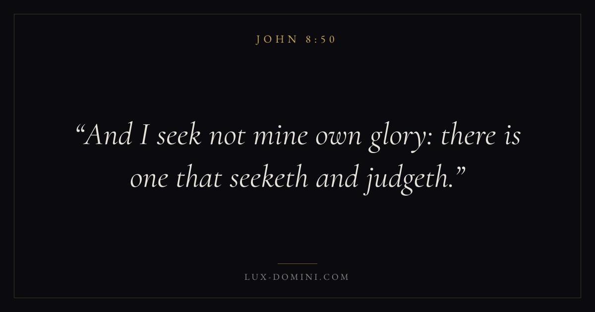 Books / John / Chapter 8 / Verse 50 ← John 8:49 John 8:50 John 8:51 → And I seek not mine own glory: there is one that seeketh and judgeth. Download verse card Share on Twitter Share on Facebook Pin it ✦ Key themes LoveFaithTruthIncarnation Read with John 8:49John 3:161 Corinthians 13:4Hebrews 11:1 Related topics Bible verses about loveBible verses about faithBible verses about truth ✦ John Chapter 8 verses V. 1 V. 2 V. 3 V. 4 V. 5 V. 6 V. 7 V. 8 V. 9 V. 10 V. 11 V. 12 V. 13 V. 14 V. 15 V. 16 V. 17 V. 18 V. 19 V. 20 V. 21 V. 22 V. 23 V. 24 V. 25 V. 26 V. 27 V. 28 V. 29 V. 30 V. 31 V. 32 V. 33 V. 34 V. 35 V. 36 V. 37 V. 38 V. 39 V. 40 V. 41 V. 42 V. 43 V. 44 V. 45 V. 46 V. 47 V. 48 V. 49 V. 50 V. 51 V. 52 V. 53 V. 54 V. 55 V. 56 V. 57 V. 58 V. 59