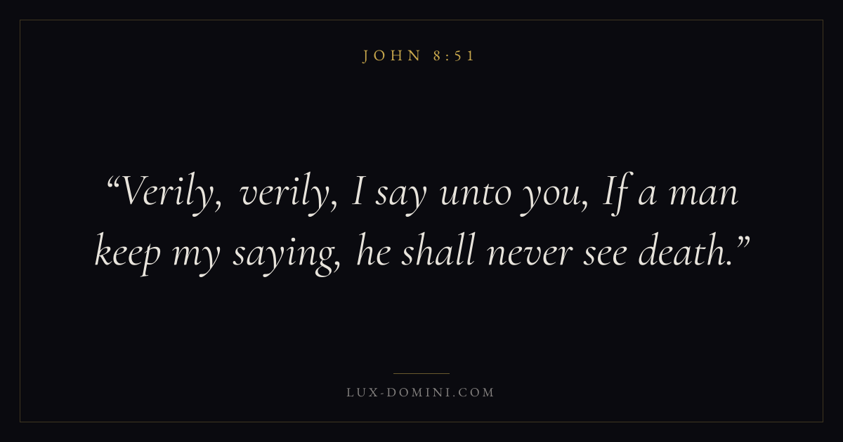 Books / John / Chapter 8 / Verse 51 ← John 8:50 John 8:51 John 8:52 → Verily, verily, I say unto you, If a man keep my saying, he shall never see death. Download verse card Share on Twitter Share on Facebook Pin it ✦ Key themes LoveFaithTruthIncarnation Read with John 8:52John 8:53John 3:161 Corinthians 13:4 Related topics Bible verses about loveBible verses about faithBible verses about truth ✦ John Chapter 8 verses V. 1 V. 2 V. 3 V. 4 V. 5 V. 6 V. 7 V. 8 V. 9 V. 10 V. 11 V. 12 V. 13 V. 14 V. 15 V. 16 V. 17 V. 18 V. 19 V. 20 V. 21 V. 22 V. 23 V. 24 V. 25 V. 26 V. 27 V. 28 V. 29 V. 30 V. 31 V. 32 V. 33 V. 34 V. 35 V. 36 V. 37 V. 38 V. 39 V. 40 V. 41 V. 42 V. 43 V. 44 V. 45 V. 46 V. 47 V. 48 V. 49 V. 50 V. 51 V. 52 V. 53 V. 54 V. 55 V. 56 V. 57 V. 58 V. 59