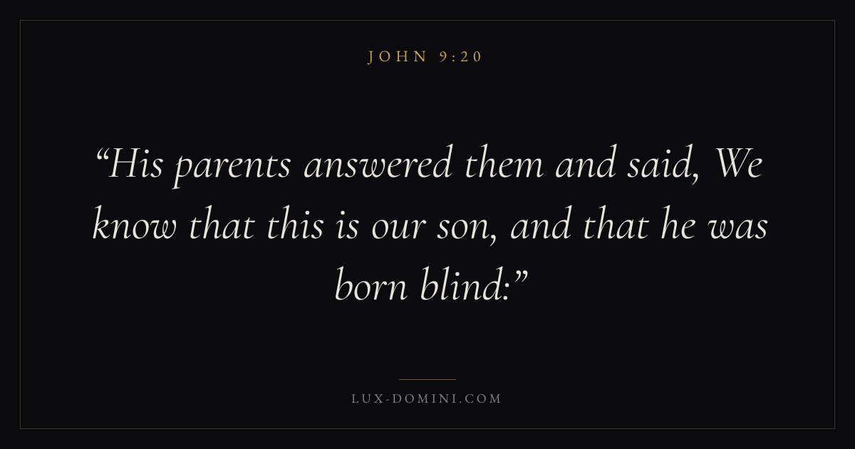 Books / John / Chapter 9 / Verse 20 ← John 9:19 John 9:20 John 9:21 → His parents answered them and said, We know that this is our son, and that he was born blind: Download verse card Share on Twitter Share on Facebook Pin it ✦ Key themes LoveFaithTruthIncarnation Read with John 9:21John 3:161 Corinthians 13:4Hebrews 11:1 Related topics Bible verses about loveBible verses about faithBible verses about truth ✦ John Chapter 9 verses V. 1 V. 2 V. 3 V. 4 V. 5 V. 6 V. 7 V. 8 V. 9 V. 10 V. 11 V. 12 V. 13 V. 14 V. 15 V. 16 V. 17 V. 18 V. 19 V. 20 V. 21 V. 22 V. 23 V. 24 V. 25 V. 26 V. 27 V. 28 V. 29 V. 30 V. 31 V. 32 V. 33 V. 34 V. 35 V. 36 V. 37 V. 38 V. 39 V. 40 V. 41