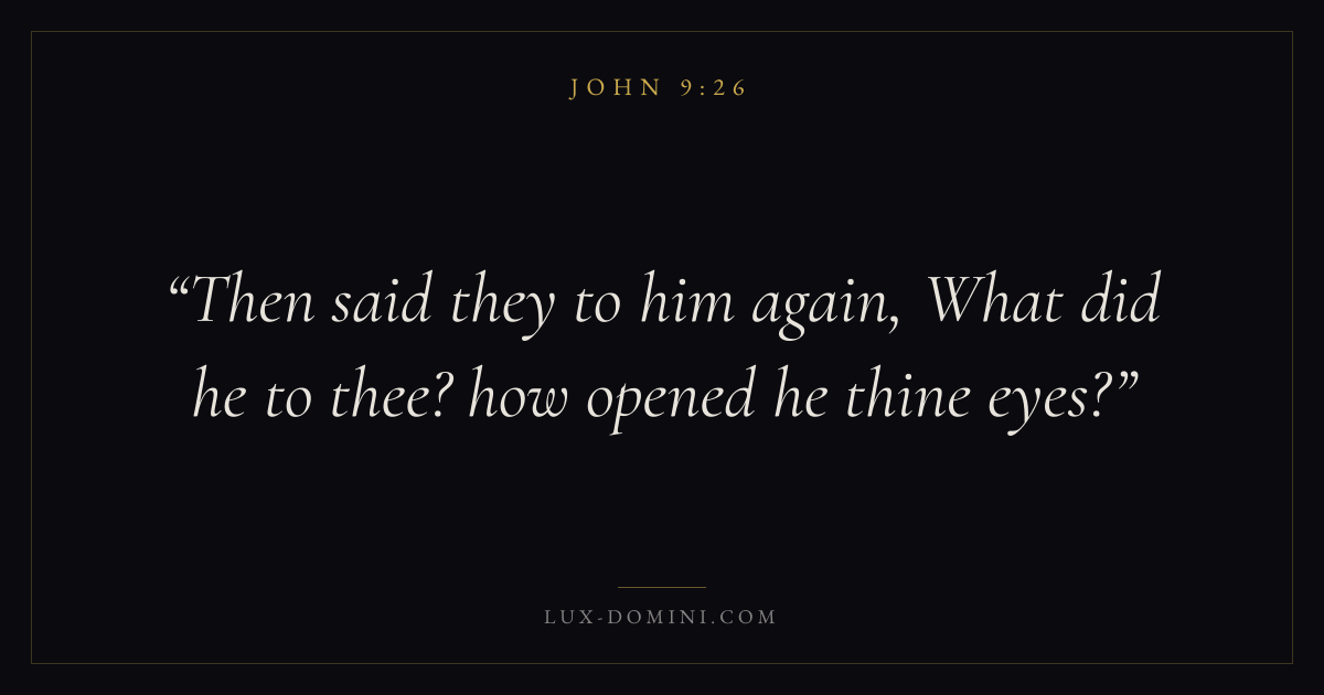 Books / John / Chapter 9 / Verse 26 ← John 9:25 John 9:26 John 9:27 → Then said they to him again, What did he to thee? how opened he thine eyes? Download verse card Share on Twitter Share on Facebook Pin it ✦ Key themes LoveFaithWisdomTruthIncarnation Read with John 9:25John 3:161 Corinthians 13:4Hebrews 11:1 Related topics Bible verses about loveBible verses about faithBible verses about wisdomBible verses about truth ✦ John Chapter 9 verses V. 1 V. 2 V. 3 V. 4 V. 5 V. 6 V. 7 V. 8 V. 9 V. 10 V. 11 V. 12 V. 13 V. 14 V. 15 V. 16 V. 17 V. 18 V. 19 V. 20 V. 21 V. 22 V. 23 V. 24 V. 25 V. 26 V. 27 V. 28 V. 29 V. 30 V. 31 V. 32 V. 33 V. 34 V. 35 V. 36 V. 37 V. 38 V. 39 V. 40 V. 41