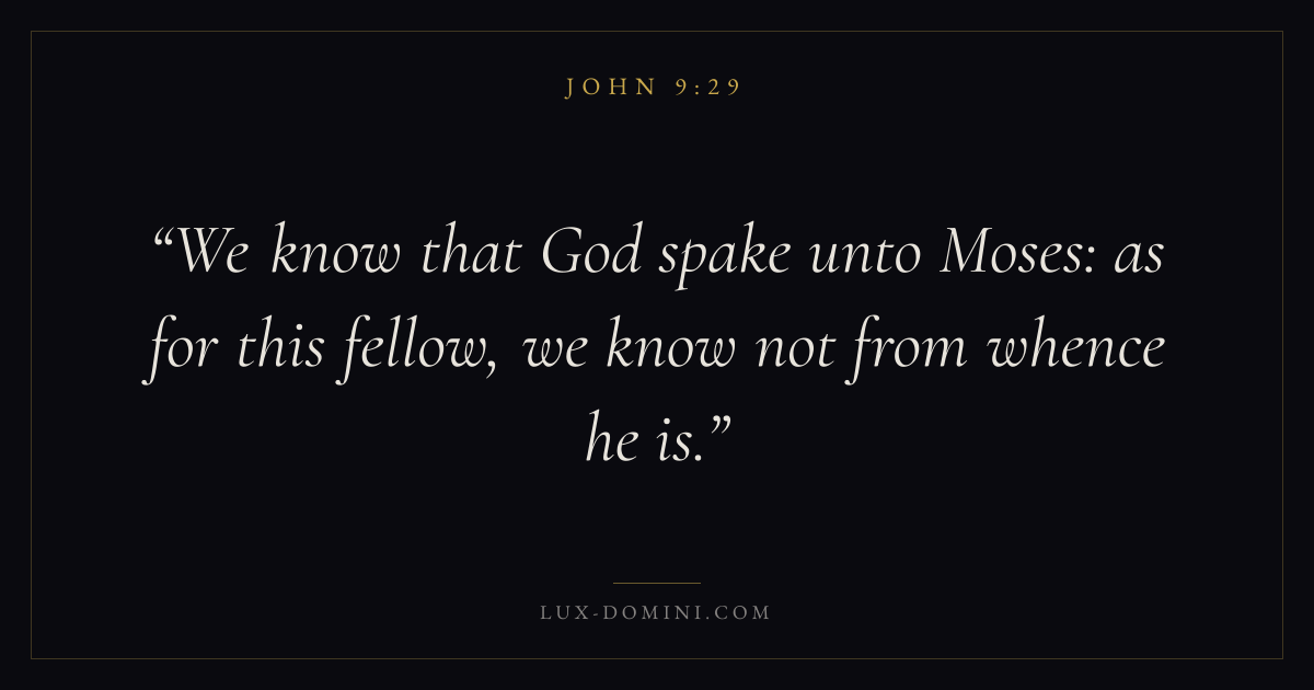 Books / John / Chapter 9 / Verse 29 ← John 9:28 John 9:29 John 9:30 → We know that God spake unto Moses: as for this fellow, we know not from whence he is. Download verse card Share on Twitter Share on Facebook Pin it ✦ Key themes LoveFaithWisdomTruthIncarnation Read with John 9:27John 9:28John 3:161 Corinthians 13:4 Related topics Bible verses about loveBible verses about faithBible verses about wisdomBible verses about truth ✦ John Chapter 9 verses V. 1 V. 2 V. 3 V. 4 V. 5 V. 6 V. 7 V. 8 V. 9 V. 10 V. 11 V. 12 V. 13 V. 14 V. 15 V. 16 V. 17 V. 18 V. 19 V. 20 V. 21 V. 22 V. 23 V. 24 V. 25 V. 26 V. 27 V. 28 V. 29 V. 30 V. 31 V. 32 V. 33 V. 34 V. 35 V. 36 V. 37 V. 38 V. 39 V. 40 V. 41