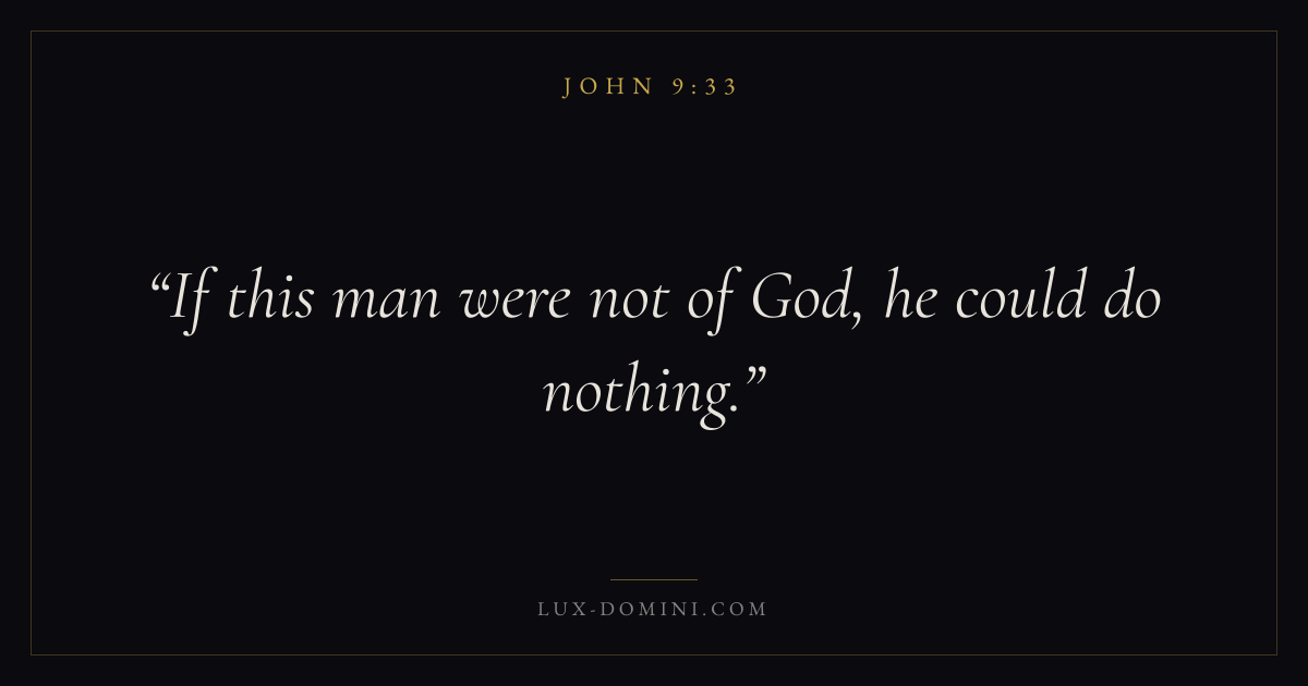 Books / John / Chapter 9 / Verse 33 ← John 9:32 John 9:33 John 9:34 → If this man were not of God, he could do nothing. Download verse card Share on Twitter Share on Facebook Pin it ✦ Key themes LoveFaithWisdomTruthIncarnation Read with John 9:32John 3:161 Corinthians 13:4Hebrews 11:1 Related topics Bible verses about loveBible verses about faithBible verses about wisdomBible verses about truth ✦ John Chapter 9 verses V. 1 V. 2 V. 3 V. 4 V. 5 V. 6 V. 7 V. 8 V. 9 V. 10 V. 11 V. 12 V. 13 V. 14 V. 15 V. 16 V. 17 V. 18 V. 19 V. 20 V. 21 V. 22 V. 23 V. 24 V. 25 V. 26 V. 27 V. 28 V. 29 V. 30 V. 31 V. 32 V. 33 V. 34 V. 35 V. 36 V. 37 V. 38 V. 39 V. 40 V. 41