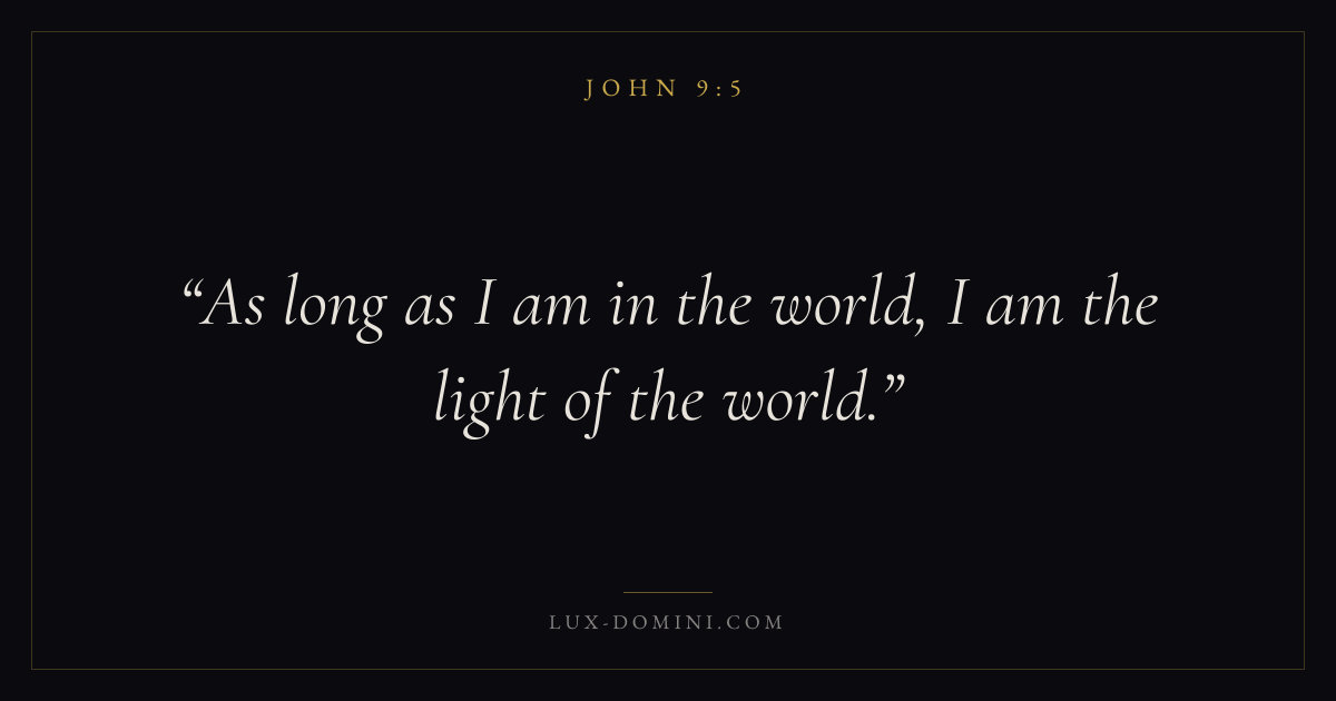 Books / John / Chapter 9 / Verse 5 ← John 9:4 John 9:5 John 9:6 → As long as I am in the world, I am the light of the world. Download verse card Share on Twitter Share on Facebook Pin it ✦ Key themes LoveFaithGraceTruthIncarnation Read with John 9:3John 9:4John 3:161 Corinthians 13:4 Related topics Bible verses about loveBible verses about faithBible verses about graceBible verses about truth ✦ John Chapter 9 verses V. 1 V. 2 V. 3 V. 4 V. 5 V. 6 V. 7 V. 8 V. 9 V. 10 V. 11 V. 12 V. 13 V. 14 V. 15 V. 16 V. 17 V. 18 V. 19 V. 20 V. 21 V. 22 V. 23 V. 24 V. 25 V. 26 V. 27 V. 28 V. 29 V. 30 V. 31 V. 32 V. 33 V. 34 V. 35 V. 36 V. 37 V. 38 V. 39 V. 40 V. 41