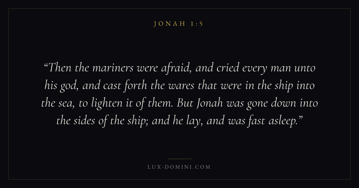 Then the mariners were afraid, and cried every man unto his god, and cast forth the wares that were in the ship into the sea, to lighten it of them. But Jonah was gone down into the sides of the ship; and he lay, and was fast asleep.