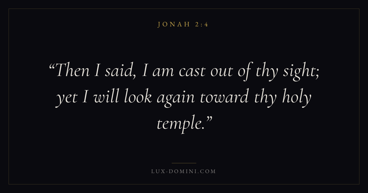 Books / Jonah / Chapter 2 / Verse 4 ← Jonah 2:3 Jonah 2:4 Jonah 2:5 → Then I said, I am cast out of thy sight; yet I will look again toward thy holy temple. Download verse card Share on Twitter Share on Facebook Pin it ✦ Key themes Suffering and trialsPrayerJustice and mercyMercy Read with Jonah 2:1Jonah 2:2Romans 8:182 Corinthians 4:17 Related topics Bible verses about suffering and trialsBible verses about prayerBible verses about justice and mercy ✦ Jonah Chapter 2 verses V. 1 V. 2 V. 3 V. 4 V. 5 V. 6 V. 7 V. 8 V. 9 V. 10