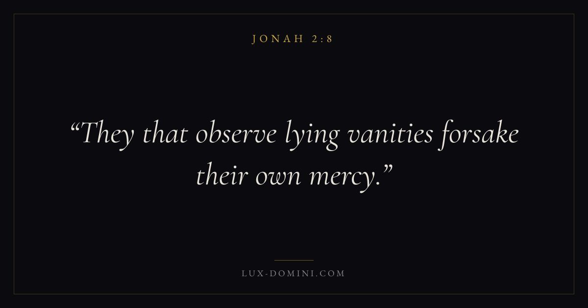Books / Jonah / Chapter 2 / Verse 8 ← Jonah 2:7 Jonah 2:8 Jonah 2:9 → They that observe lying vanities forsake their own mercy. Download verse card Share on Twitter Share on Facebook Pin it ✦ Key themes Suffering and trialsPrayerJustice and mercyMercy Read with Jonah 2:9Romans 8:182 Corinthians 4:17Matthew 6:9 Related topics Bible verses about suffering and trialsBible verses about prayerBible verses about justice and mercy ✦ Jonah Chapter 2 verses V. 1 V. 2 V. 3 V. 4 V. 5 V. 6 V. 7 V. 8 V. 9 V. 10