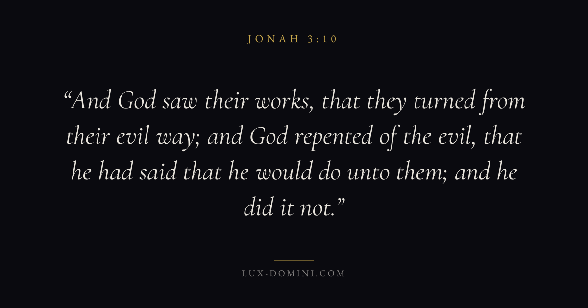 And God saw their works, that they turned from their evil way; and God repented of the evil, that he had said that he would do unto them; and he did it not.