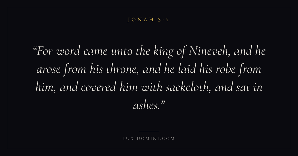 For word came unto the king of Nineveh, and he arose from his throne, and he laid his robe from him, and covered him with sackcloth, and sat in ashes.