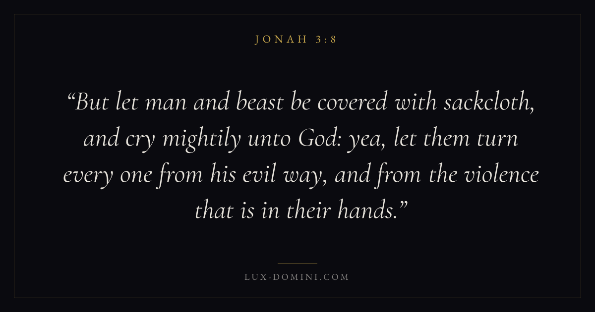 But let man and beast be covered with sackcloth, and cry mightily unto God: yea, let them turn every one from his evil way, and from the violence that is in their hands.