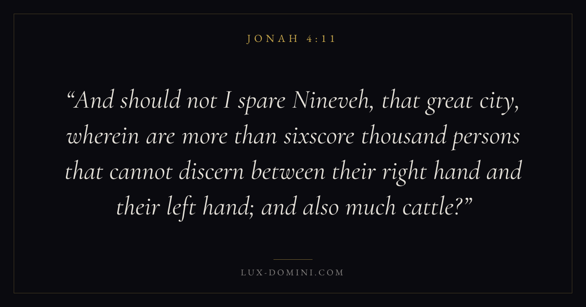 And should not I spare Nineveh, that great city, wherein are more than sixscore thousand persons that cannot discern between their right hand and their left hand; and also much cattle?