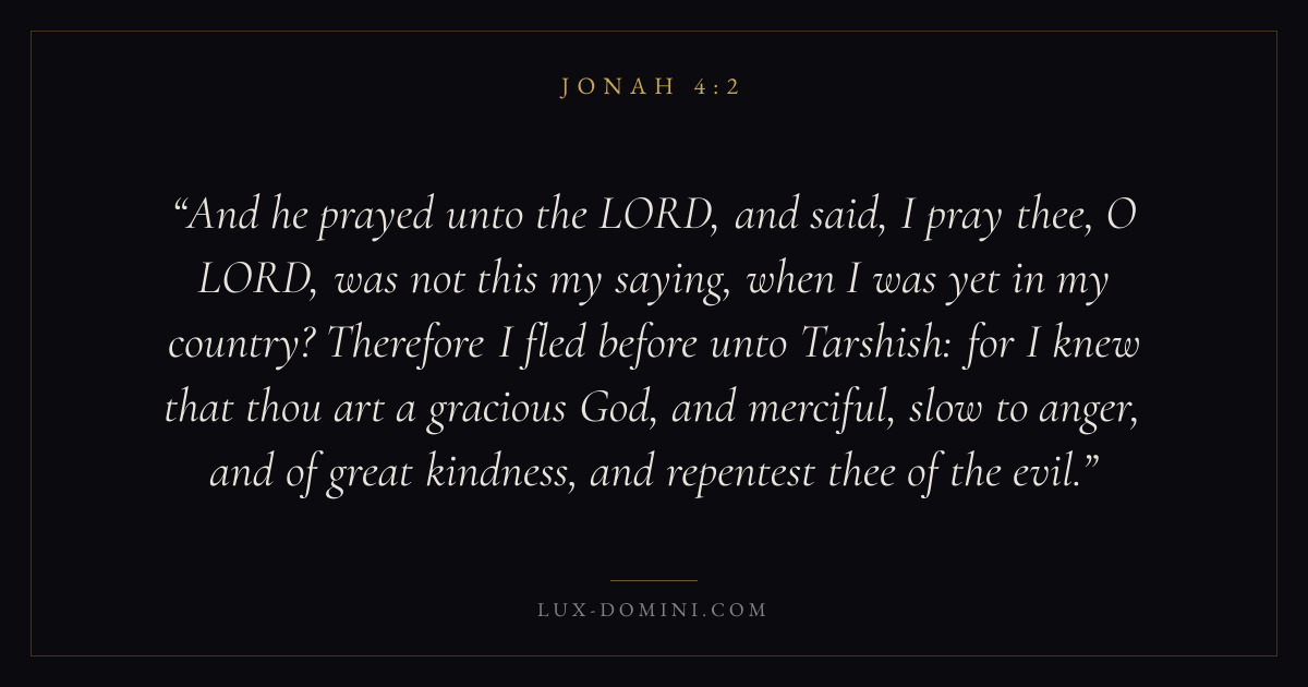 And he prayed unto the LORD, and said, I pray thee, O LORD, was not this my saying, when I was yet in my country? Therefore I fled before unto Tarshish: for I knew that thou art a gracious God, and merciful, slow to anger, and of great kindness, and repentest thee of the evil.