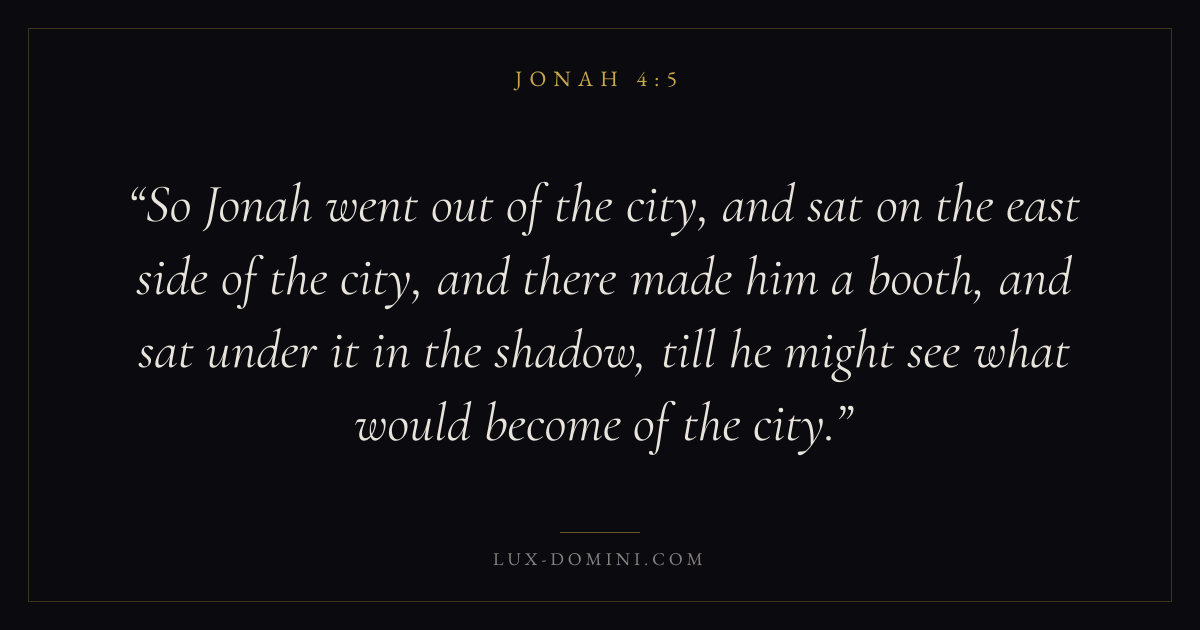 So Jonah went out of the city, and sat on the east side of the city, and there made him a booth, and sat under it in the shadow, till he might see what would become of the city.