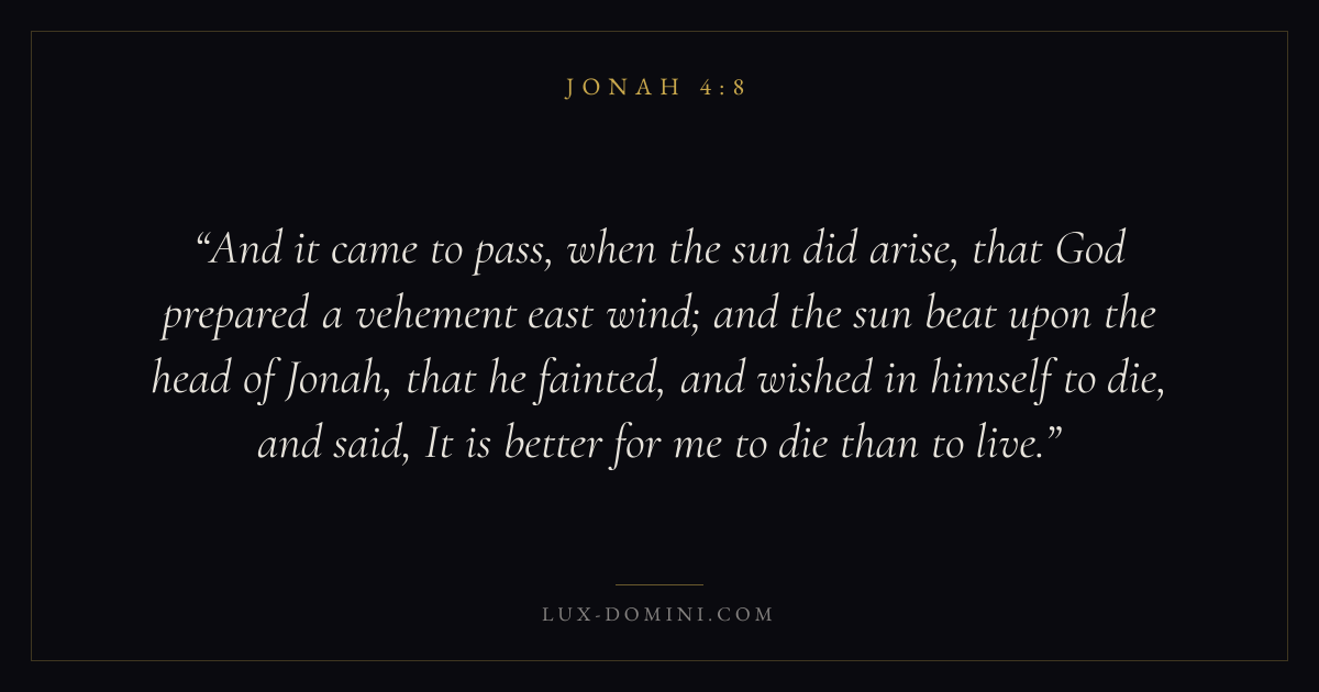 And it came to pass, when the sun did arise, that God prepared a vehement east wind; and the sun beat upon the head of Jonah, that he fainted, and wished in himself to die, and said, It is better for me to die than to live.