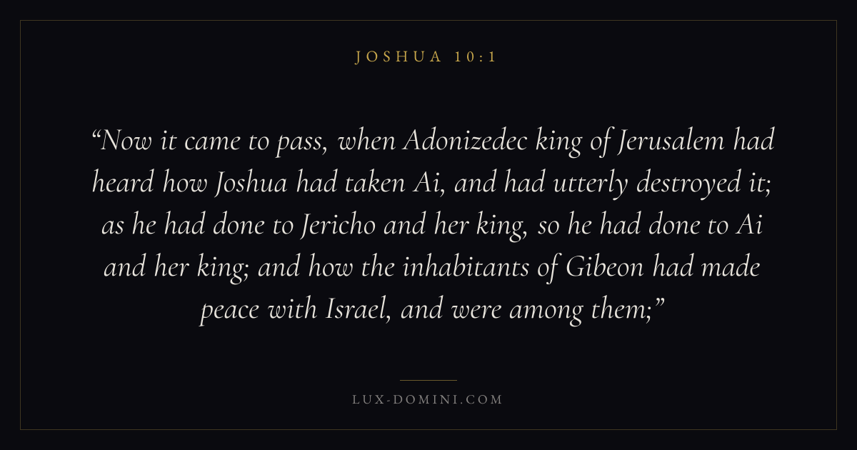 Now it came to pass, when Adonizedec king of Jerusalem had heard how Joshua had taken Ai, and had utterly destroyed it; as he had done to Jericho and her king, so he had done to Ai and her king; and how the inhabitants of Gibeon had made peace with Israel, and were among them;