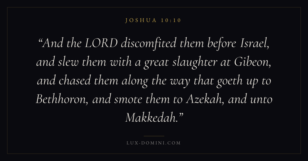 And the LORD discomfited them before Israel, and slew them with a great slaughter at Gibeon, and chased them along the way that goeth up to Bethhoron, and smote them to Azekah, and unto Makkedah.