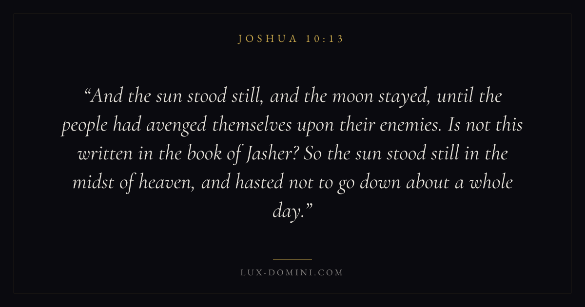 And the sun stood still, and the moon stayed, until the people had avenged themselves upon their enemies. Is not this written in the book of Jasher? So the sun stood still in the midst of heaven, and hasted not to go down about a whole day.