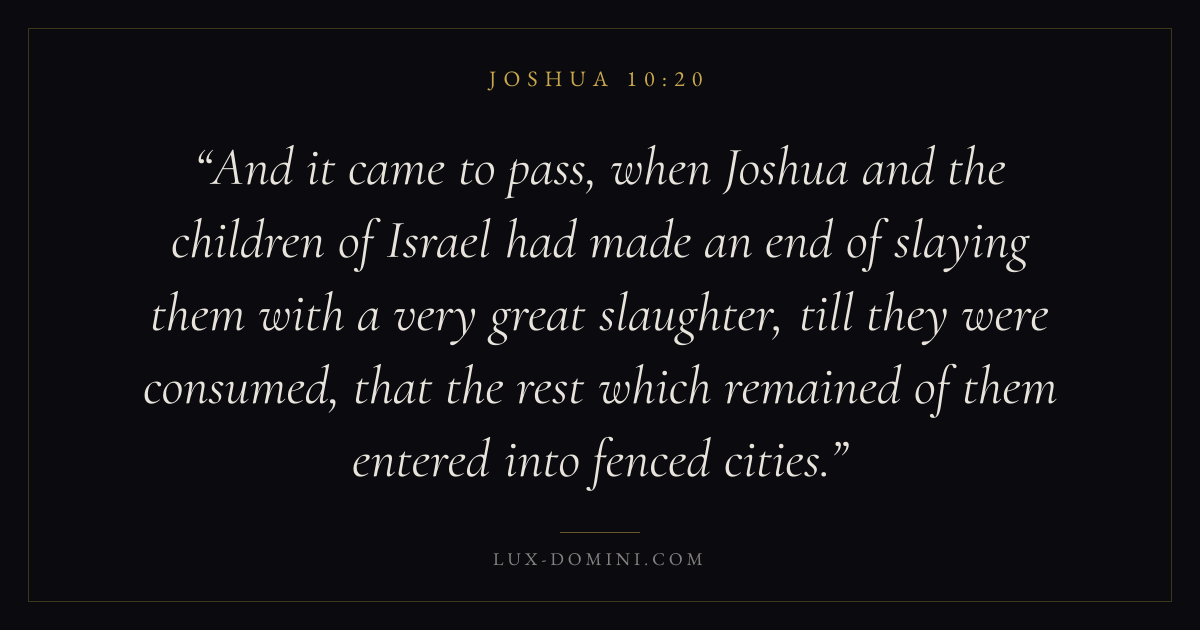 And it came to pass, when Joshua and the children of Israel had made an end of slaying them with a very great slaughter, till they were consumed, that the rest which remained of them entered into fenced cities.