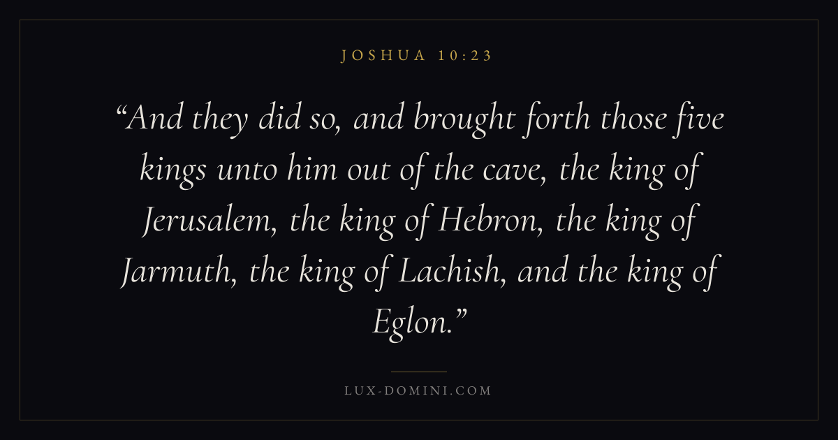 And they did so, and brought forth those five kings unto him out of the cave, the king of Jerusalem, the king of Hebron, the king of Jarmuth, the king of Lachish, and the king of Eglon.