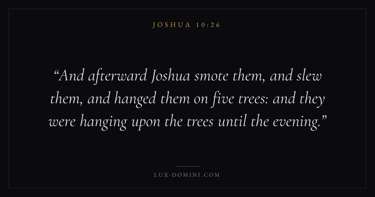 And afterward Joshua smote them, and slew them, and hanged them on five trees: and they were hanging upon the trees until the evening.