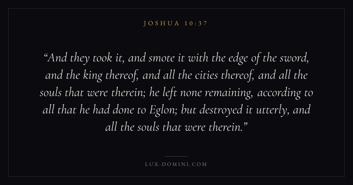 And they took it, and smote it with the edge of the sword, and the king thereof, and all the cities thereof, and all the souls that were therein; he left none remaining, according to all that he had done to Eglon; but destroyed it utterly, and all the souls that were therein.