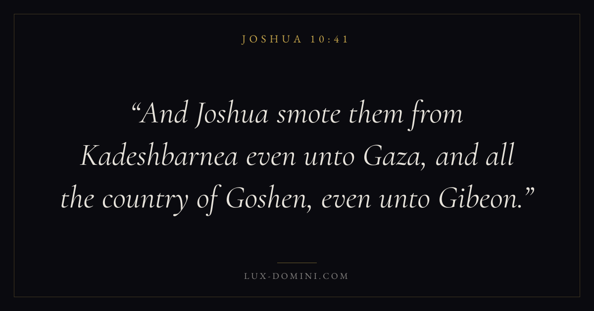 And Joshua smote them from Kadeshbarnea even unto Gaza, and all the country of Goshen, even unto Gibeon.