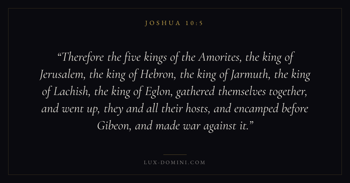 Therefore the five kings of the Amorites, the king of Jerusalem, the king of Hebron, the king of Jarmuth, the king of Lachish, the king of Eglon, gathered themselves together, and went up, they and all their hosts, and encamped before Gibeon, and made war against it.
