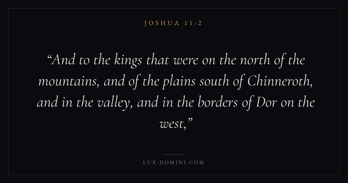 And to the kings that were on the north of the mountains, and of the plains south of Chinneroth, and in the valley, and in the borders of Dor on the west,