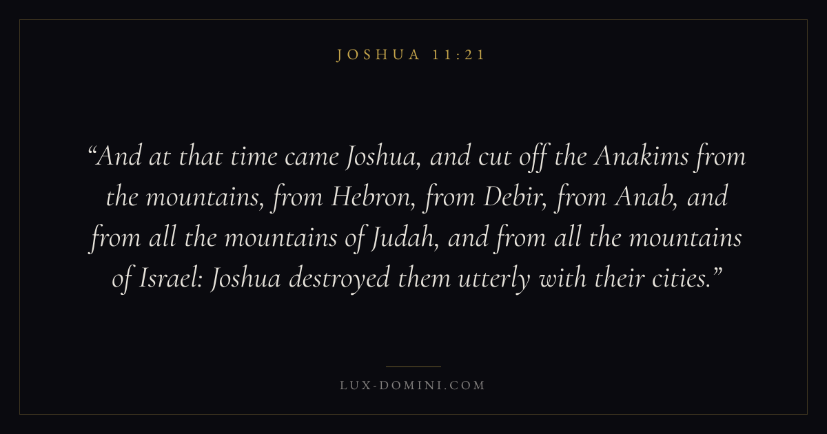And at that time came Joshua, and cut off the Anakims from the mountains, from Hebron, from Debir, from Anab, and from all the mountains of Judah, and from all the mountains of Israel: Joshua destroyed them utterly with their cities.