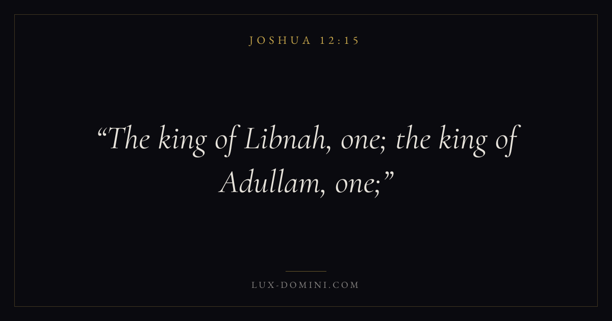 Books / Joshua / Chapter 12 / Verse 15 ← Joshua 12:14 Joshua 12:15 Joshua 12:16 → The king of Libnah, one; the king of Adullam, one; Download verse card Share on Twitter Share on Facebook Pin it ✦ Key themes PeaceInheritanceRestCovenant fidelity Read with Joshua 12:14Joshua 12:16John 14:27Philippians 4:7 Related topics Bible verses about peaceBible verses about rest and weariness Glossary Adullam Place Biblical settlement. Modern identification: Khirbet esh Sheikh Madhkur. Libnah Place Biblical settlement. Modern identification: Tell Bornat. ✦ Joshua Chapter 12 verses V. 1 V. 2 V. 3 V. 4 V. 5 V. 6 V. 7 V. 8 V. 9 V. 10 V. 11 V. 12 V. 13 V. 14 V. 15 V. 16 V. 17 V. 18 V. 19 V. 20 V. 21 V. 22 V. 23 V. 24