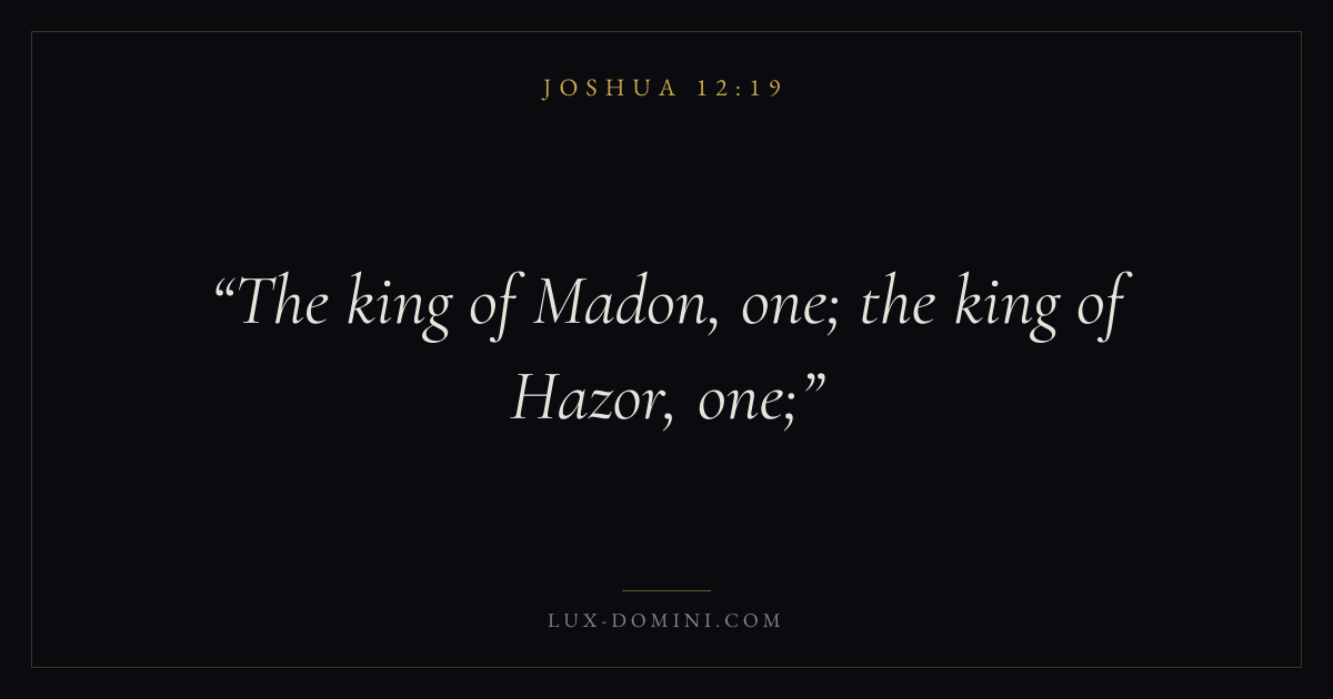 Books / Joshua / Chapter 12 / Verse 19 ← Joshua 12:18 Joshua 12:19 Joshua 12:20 → The king of Madon, one; the king of Hazor, one; Download verse card Share on Twitter Share on Facebook Pin it ✦ Key themes PeaceInheritanceRestCovenant fidelity Read with Joshua 12:20Joshua 12:21John 14:27Philippians 4:7 Related topics Bible verses about peaceBible verses about rest and weariness Glossary Hazor Place Biblical settlement. Modern identification: Tel Hazor. Madon Place Biblical settlement. Modern identification: Tell el Khirbeh. ✦ Joshua Chapter 12 verses V. 1 V. 2 V. 3 V. 4 V. 5 V. 6 V. 7 V. 8 V. 9 V. 10 V. 11 V. 12 V. 13 V. 14 V. 15 V. 16 V. 17 V. 18 V. 19 V. 20 V. 21 V. 22 V. 23 V. 24