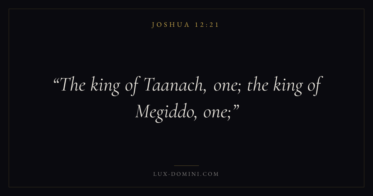 Books / Joshua / Chapter 12 / Verse 21 ← Joshua 12:20 Joshua 12:21 Joshua 12:22 → The king of Taanach, one; the king of Megiddo, one; Download verse card Share on Twitter Share on Facebook Pin it ✦ Key themes PeaceInheritanceRestCovenant fidelity Read with Joshua 12:19Joshua 12:20John 14:27Philippians 4:7 Related topics Bible verses about peaceBible verses about rest and weariness Glossary Megiddo Place Biblical settlement. Modern identification: Tel Megiddo. Taanach Place Biblical settlement. Modern identification: Tell Ta’anakh. ✦ Joshua Chapter 12 verses V. 1 V. 2 V. 3 V. 4 V. 5 V. 6 V. 7 V. 8 V. 9 V. 10 V. 11 V. 12 V. 13 V. 14 V. 15 V. 16 V. 17 V. 18 V. 19 V. 20 V. 21 V. 22 V. 23 V. 24