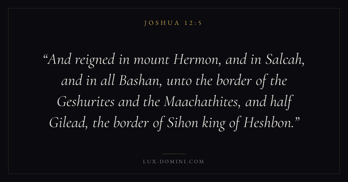 And reigned in mount Hermon, and in Salcah, and in all Bashan, unto the border of the Geshurites and the Maachathites, and half Gilead, the border of Sihon king of Heshbon.