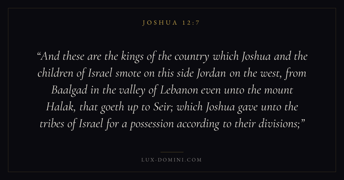 And these are the kings of the country which Joshua and the children of Israel smote on this side Jordan on the west, from Baalgad in the valley of Lebanon even unto the mount Halak, that goeth up to Seir; which Joshua gave unto the tribes of Israel for a possession according to their divisions;