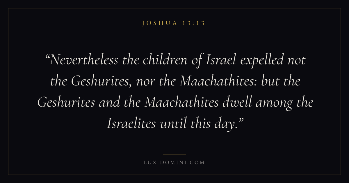 Nevertheless the children of Israel expelled not the Geshurites, nor the Maachathites: but the Geshurites and the Maachathites dwell among the Israelites until this day.