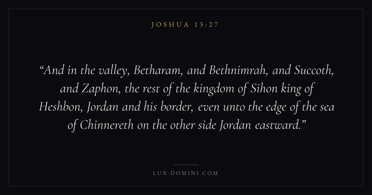 And in the valley, Betharam, and Bethnimrah, and Succoth, and Zaphon, the rest of the kingdom of Sihon king of Heshbon, Jordan and his border, even unto the edge of the sea of Chinnereth on the other side Jordan eastward.