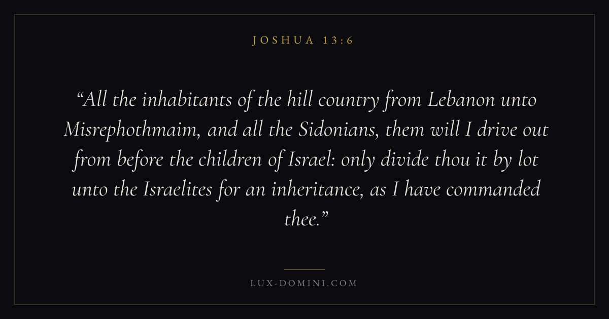 All the inhabitants of the hill country from Lebanon unto Misrephothmaim, and all the Sidonians, them will I drive out from before the children of Israel: only divide thou it by lot unto the Israelites for an inheritance, as I have commanded thee.