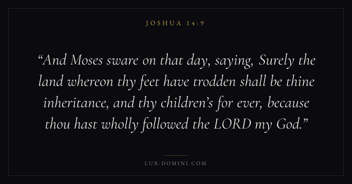 And Moses sware on that day, saying, Surely the land whereon thy feet have trodden shall be thine inheritance, and thy children’s for ever, because thou hast wholly followed the LORD my God.