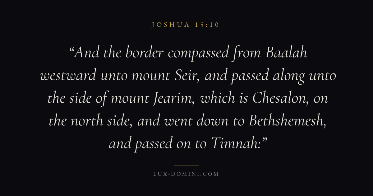 And the border compassed from Baalah westward unto mount Seir, and passed along unto the side of mount Jearim, which is Chesalon, on the north side, and went down to Bethshemesh, and passed on to Timnah: