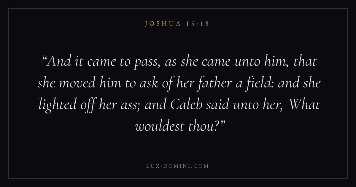 And it came to pass, as she came unto him, that she moved him to ask of her father a field: and she lighted off her ass; and Caleb said unto her, What wouldest thou?