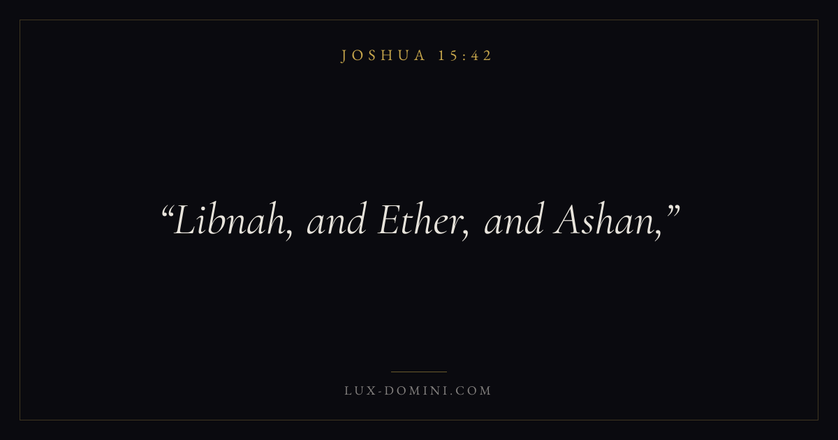 Books / Joshua / Chapter 15 / Verse 42 ← Joshua 15:41 Joshua 15:42 Joshua 15:43 → Libnah, and Ether, and Ashan, Download verse card Share on Twitter Share on Facebook Pin it ✦ Key themes PeaceInheritanceRestCovenant fidelity Read with Joshua 15:40Joshua 15:41John 14:27Philippians 4:7 Related topics Bible verses about peaceBible verses about rest and weariness Glossary Ashan Place Biblical settlement. Modern identification: Khirbet Asan. Ether Place Biblical settlement. Modern identification: Khirbet el Ater. Libnah Place Biblical settlement. Modern identification: Tell Bornat. ✦ Joshua Chapter 15 verses V. 1 V. 2 V. 3 V. 4 V. 5 V. 6 V. 7 V. 8 V. 9 V. 10 V. 11 V. 12 V. 13 V. 14 V. 15 V. 16 V. 17 V. 18 V. 19 V. 20 V. 21 V. 22 V. 23 V. 24 V. 25 V. 26 V. 27 V. 28 V. 29 V. 30 V. 31 V. 32 V. 33 V. 34 V. 35 V. 36 V. 37 V. 38 V. 39 V. 40 V. 41 V. 42 V. 43 V. 44 V. 45 V. 46 V. 47 V. 48 V. 49 V. 50 V. 51 V. 52 V. 53 V. 54 V. 55 V. 56 V. 57 V. 58 V. 59 V. 60 V. 61 V. 62 V. 63