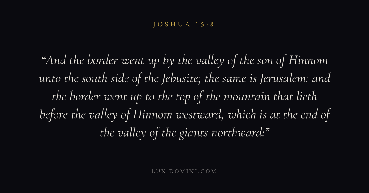 And the border went up by the valley of the son of Hinnom unto the south side of the Jebusite; the same is Jerusalem: and the border went up to the top of the mountain that lieth before the valley of Hinnom westward, which is at the end of the valley of the giants northward: